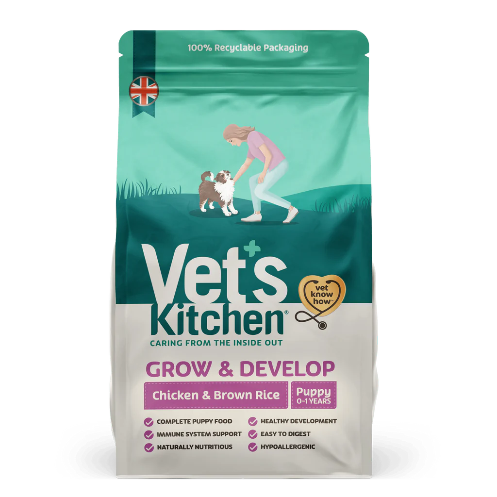 Vet’s Kitchen® Grow & Develop Chicken & Brown Rice is a complete dry dog food which provides perfectly balanced nutrition in a delicious tasting meal to help puppies grow & develop into healthy adult dogs.